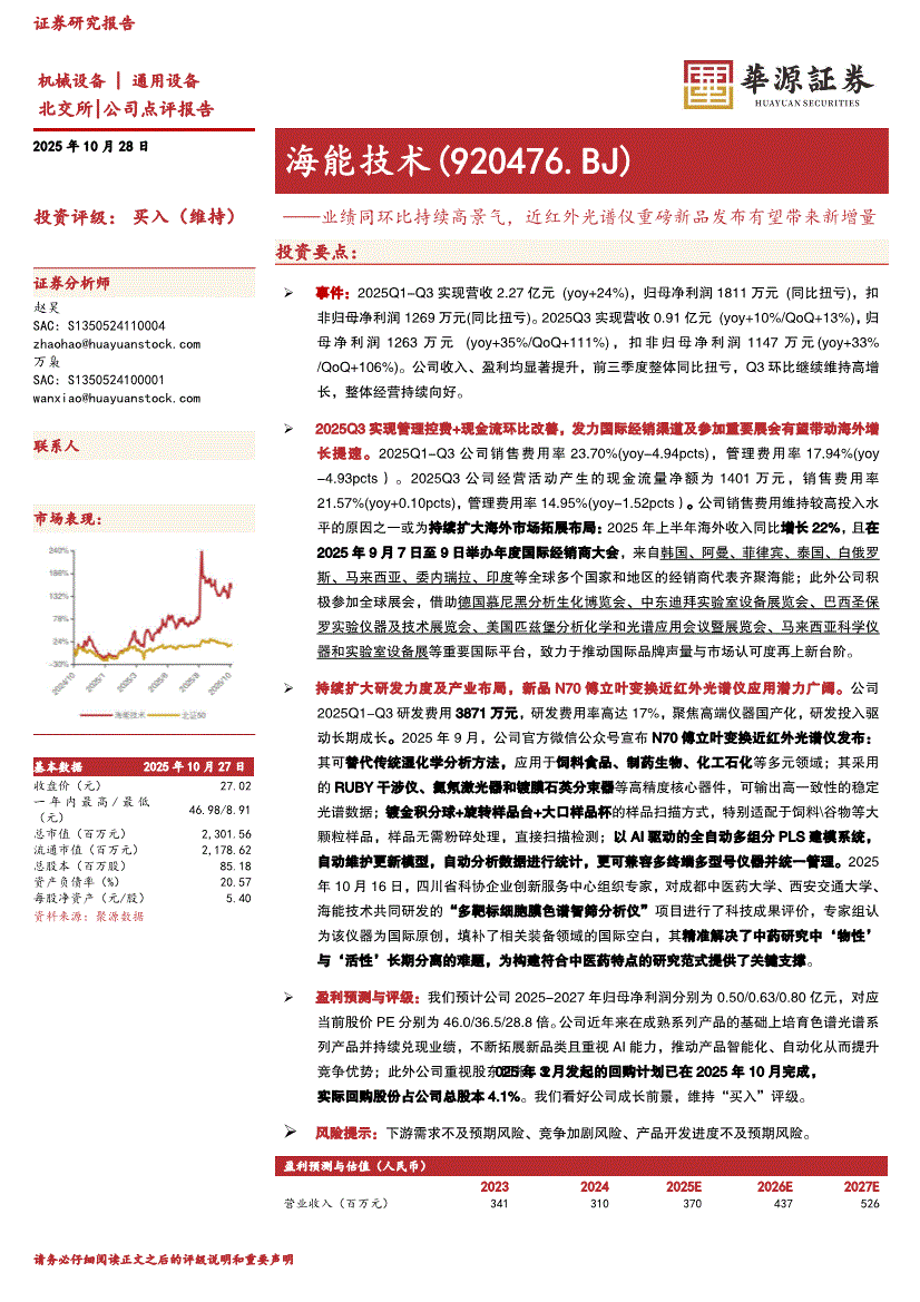 海能技术:华源证券-海能技术-920476-业绩同环比持续高景气,近红外光谱仪重磅新品发布有望带来新增量-251028