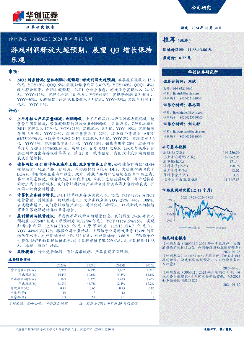 神州泰岳:华创证券-神州泰岳-300002-2024年半年报点评:游戏利润释放大超预期,展望Q3增长保持乐观-240830