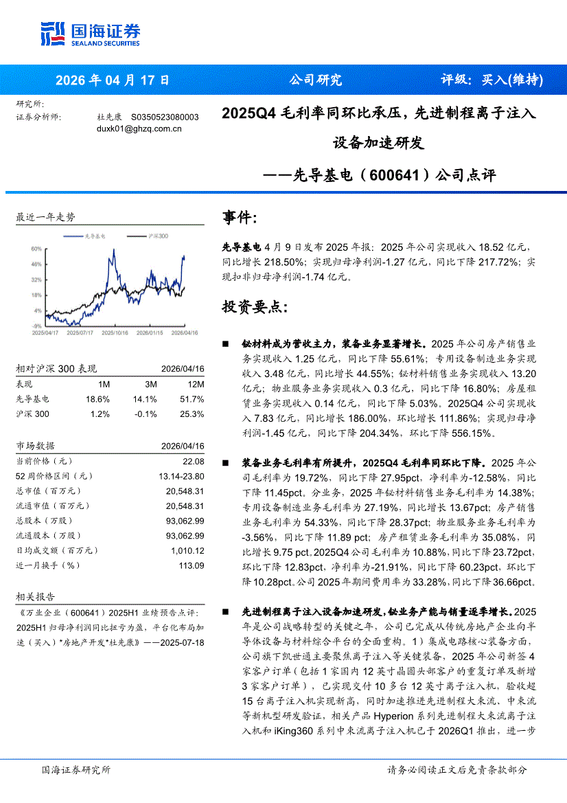 先导基电:国海证券-先导基电-600641-公司点评:2025Q4毛利率同环比承压,先进制程离子注入设备加速研发-260417