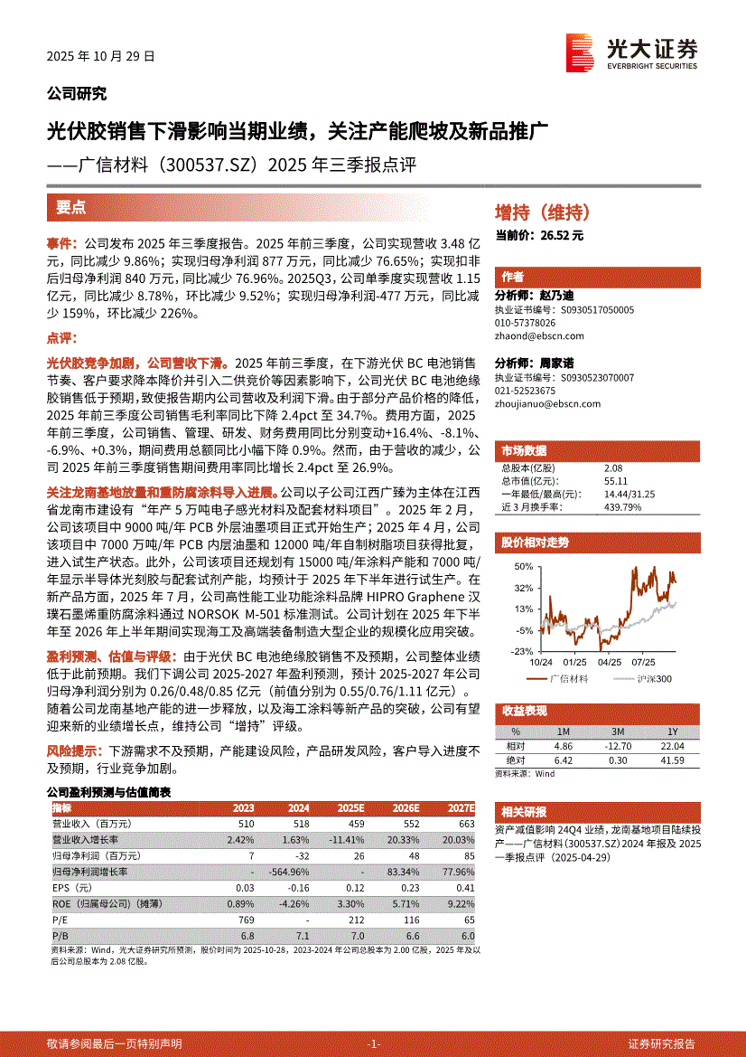 广信材料:光大证券-广信材料-300537-2025年三季报点评:光伏胶销售下滑影响当期业绩,关注产能爬坡及新品推广-251029