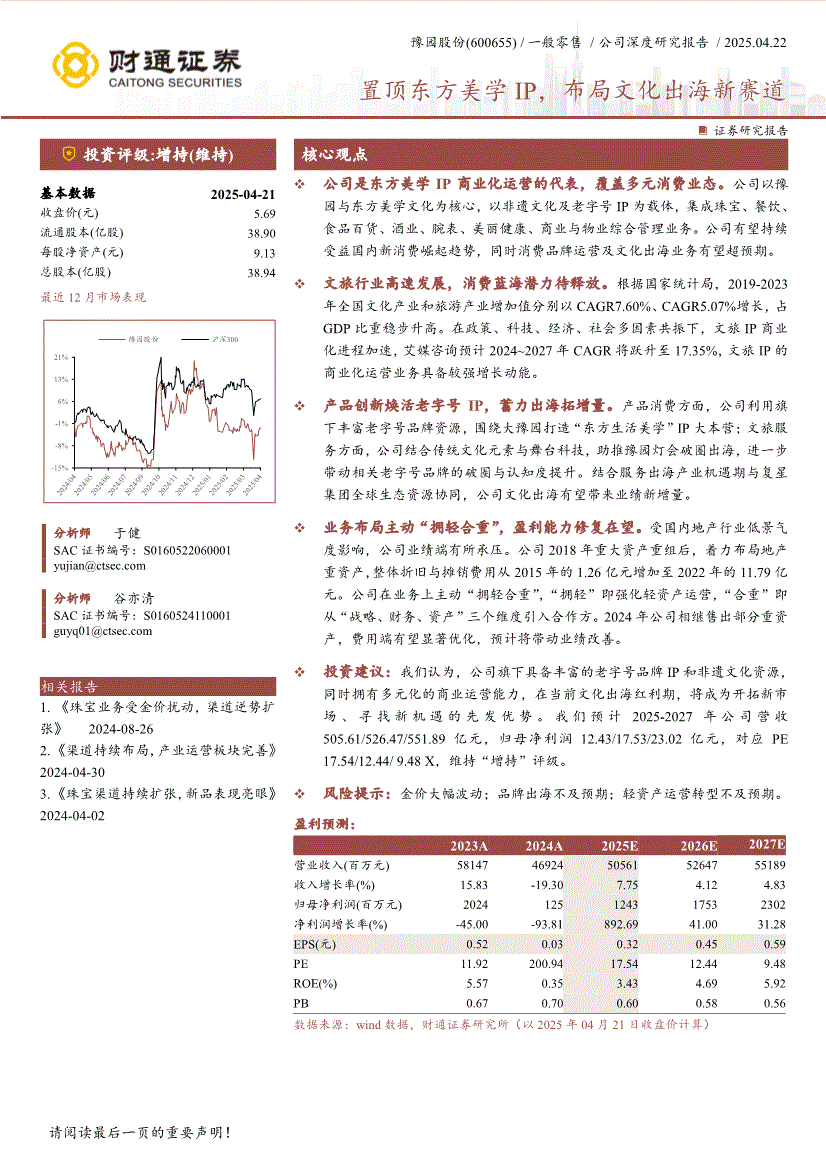 豫园股份:财通证券-豫园股份-600655-置顶东方美学IP,布局文化出海新赛道-250422