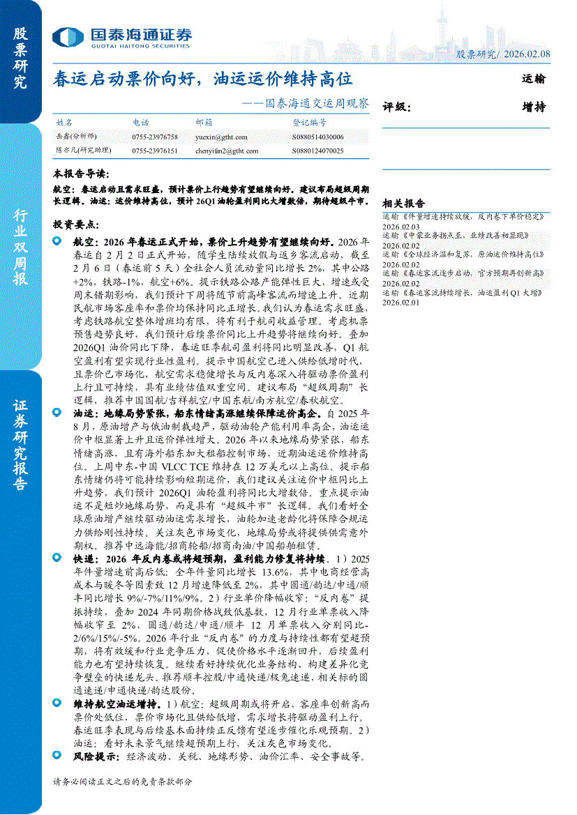交运行业:国泰海通证券-交运行业周观察:春运启动票价向好,油运运价维持高位-260208