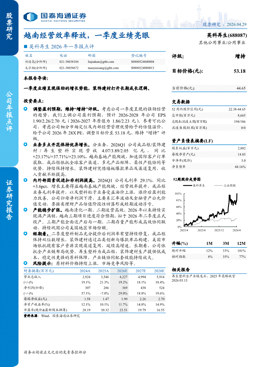 英科再生:国泰海通证券-英科再生-688087-2026年一季报点评:越南经营效率释放,一季度业绩亮眼-260429