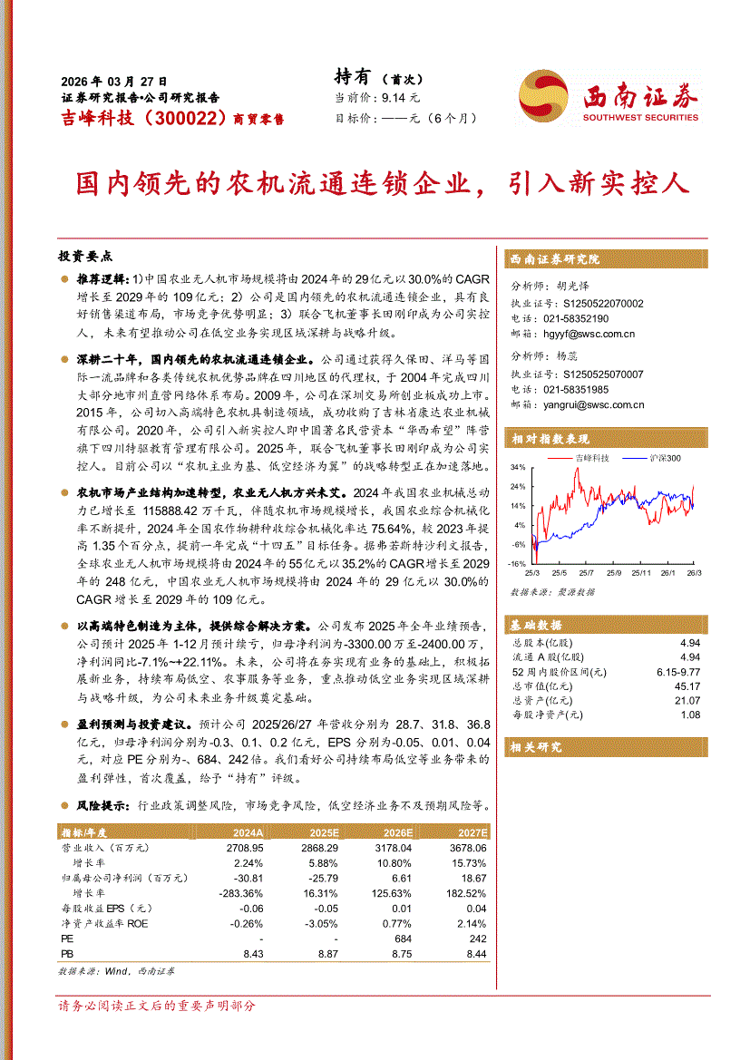 吉峰科技:西南证券-吉峰科技-300022-国内领先的农机流通连锁企业,引入新实控人-260327