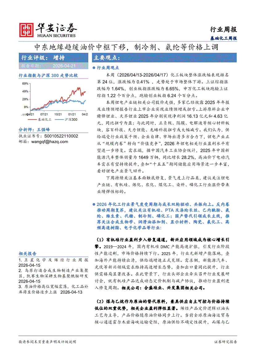 基础化工行业:华安证券-基础化工行业周报:中东地缘趋缓油价中枢下移,制冷剂、氨纶等价格上调-260421