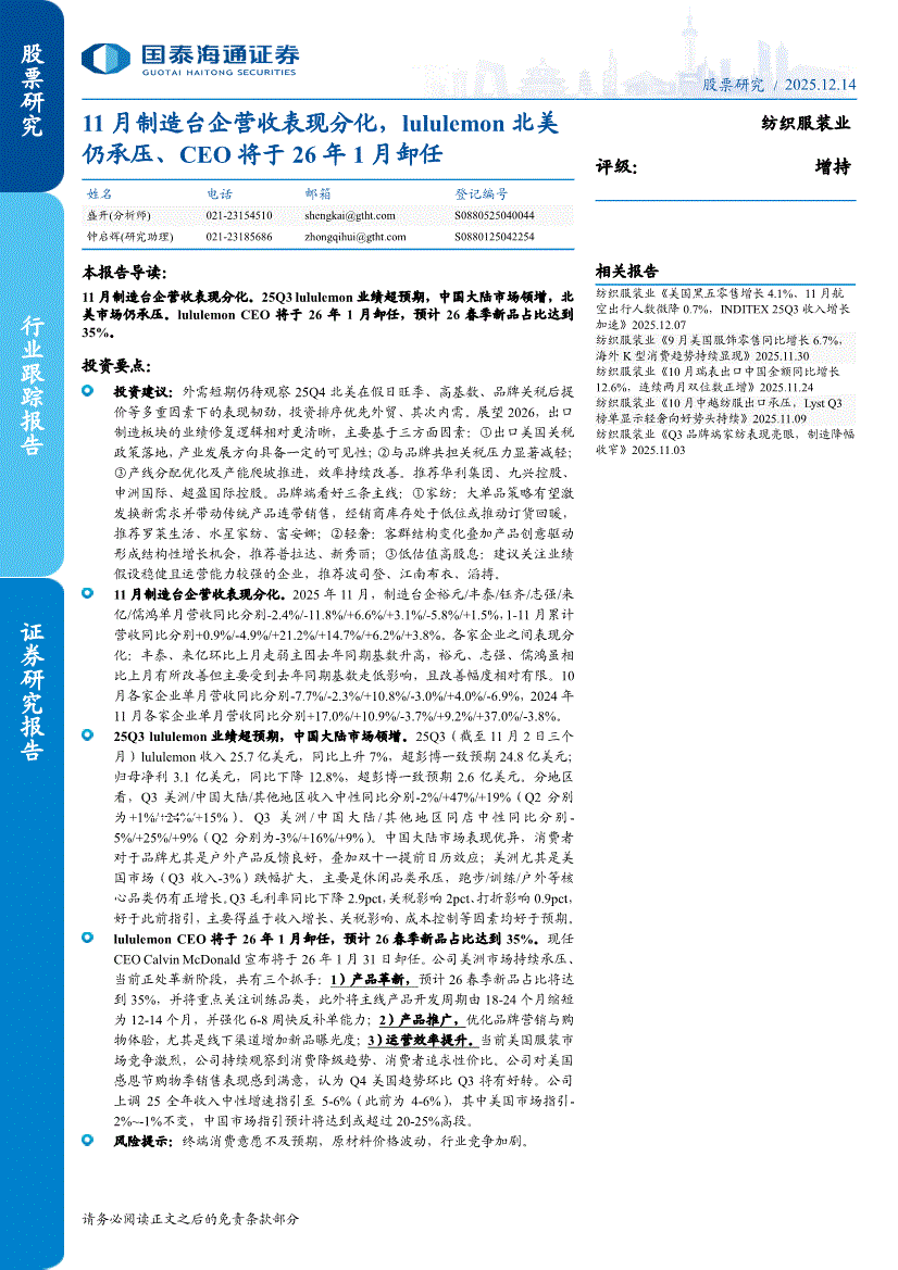 纺织服装行业:国泰海通证券-纺织服装行业:11月制造台企营收表现分化,lululemon北美仍承压、CEO将于26年1月卸任-251214