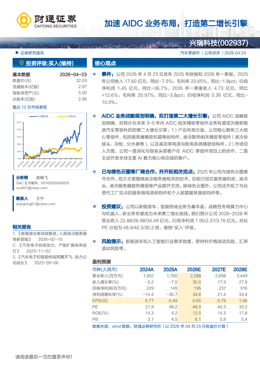 兴瑞科技:财通证券-兴瑞科技-002937-加速AIDC业务布局,打造第二增长引擎-260424