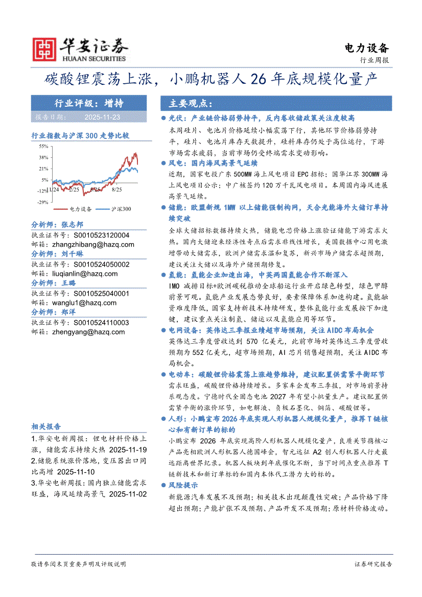 电力设备行业:华安证券-电力设备行业周报:碳酸锂震荡上涨,小鹏机器人26年底规模化量产-251123