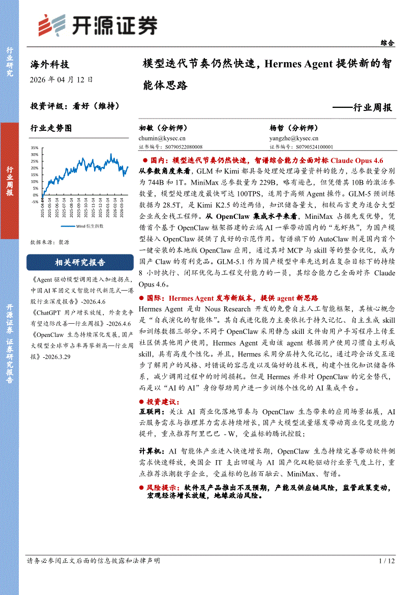 开源证券-海外科技行业周报:模型迭代节奏仍然快速,Hermes Agent提供新的智能体思路-260412