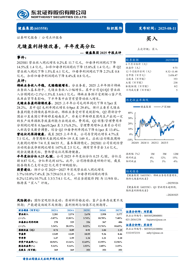 健盛集团:东北证券-健盛集团-603558-2025中报点评:无缝盈利持续改善,半年度高分红-250811