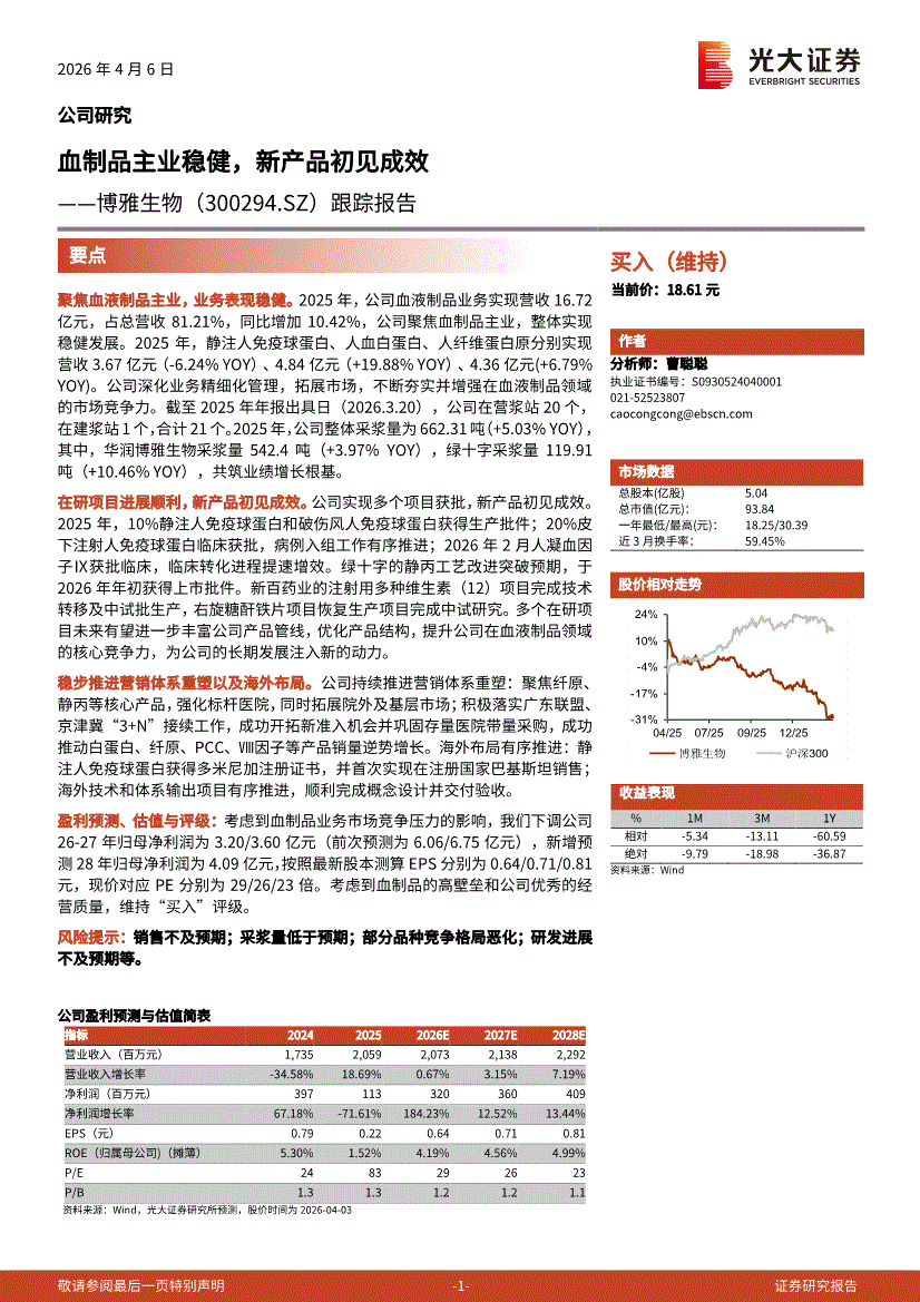 博雅生物:光大证券-博雅生物-300294-跟踪报告:血制品主业稳健,新产品初见成效-260406