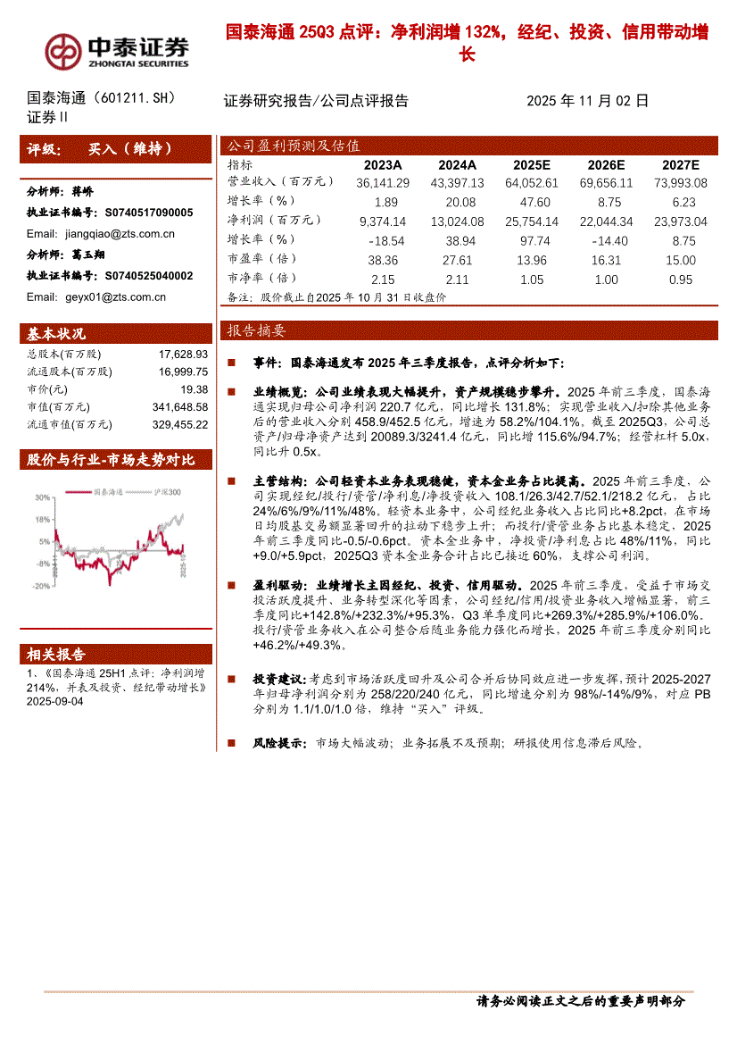 国泰海通:中泰证券-国泰海通-601211-25Q3点评:净利润增132%,经纪、投资、信用带动增长-251102