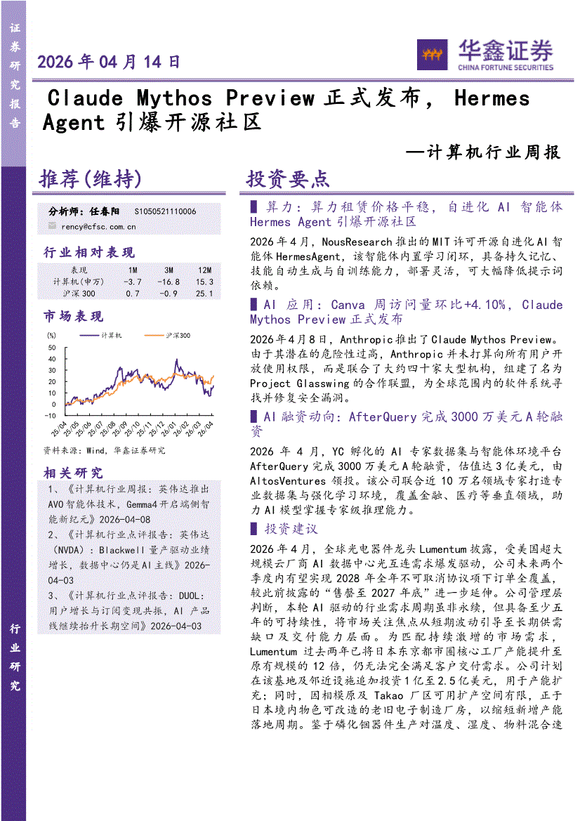 计算机行业:华鑫证券-计算机行业周报:Claude Mythos Preview正式发布,Hermes Agent引爆开源社区-260414