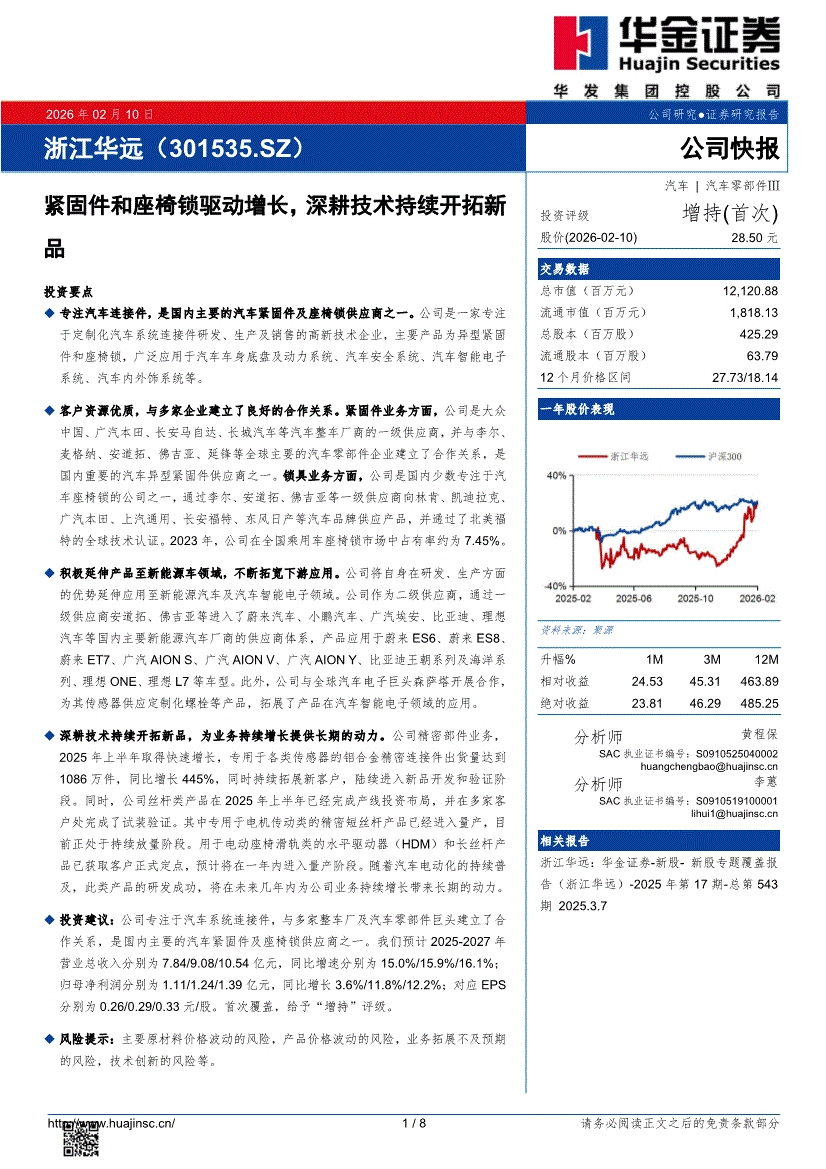 浙江华远:华金证券-浙江华远-301535-紧固件和座椅锁驱动增长,深耕技术持续开拓新品-260210