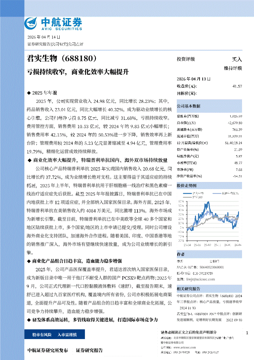 君实生物:中航证券-君实生物-688180-亏损持续收窄,商业化效率大幅提升-260414