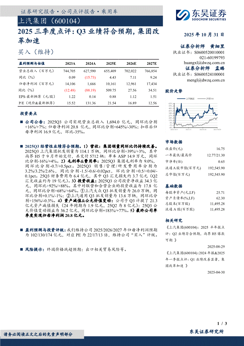 上汽集团:东吴证券-上汽集团-600104-2025三季度点评:Q3业绩符合预期,集团改革加速-251031
