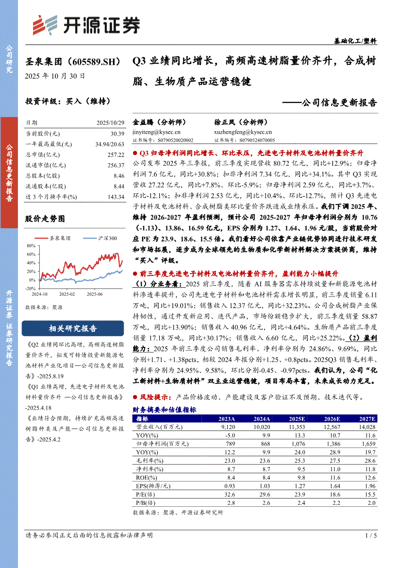 圣泉集团:开源证券-圣泉集团-605589-公司信息更新报告:Q3业绩同比增长,高频高速树脂量价齐升,合成树脂、生物质产品运营稳健-251030