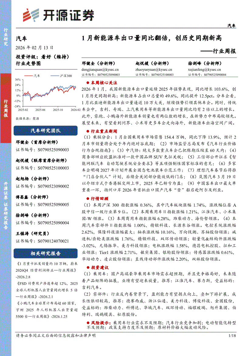 汽车行业:开源证券-汽车行业周报:1月新能源车出口量同比翻倍,创历史同期新高-260213