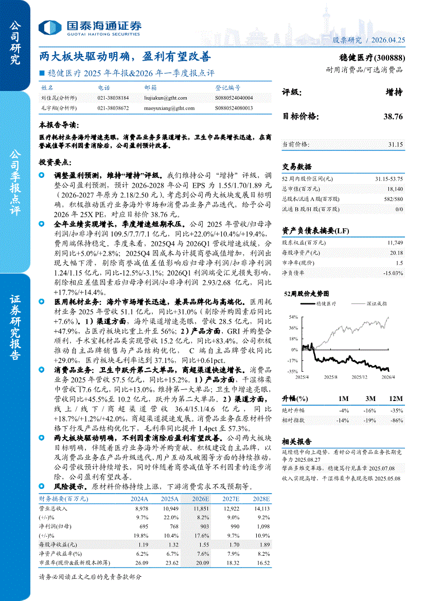稳健医疗:国泰海通证券-稳健医疗-300888-2025年年报&2026年一季度报点评:两大板块驱动明确,盈利有望改善-260425