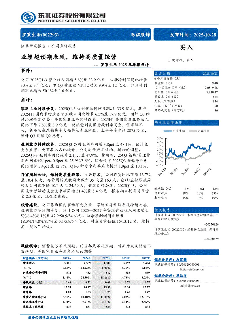 罗莱生活:东北证券-罗莱生活-002293-2025三季报点评:业绩超预期表现,维持高质量经营-251028