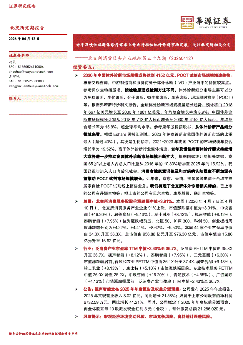 华源证券-北交所消费服务产业跟踪第五十九期:老年及慢性病群体诊疗需求上升或将推动体外诊断市场发展,关注北交所相关公司-260412