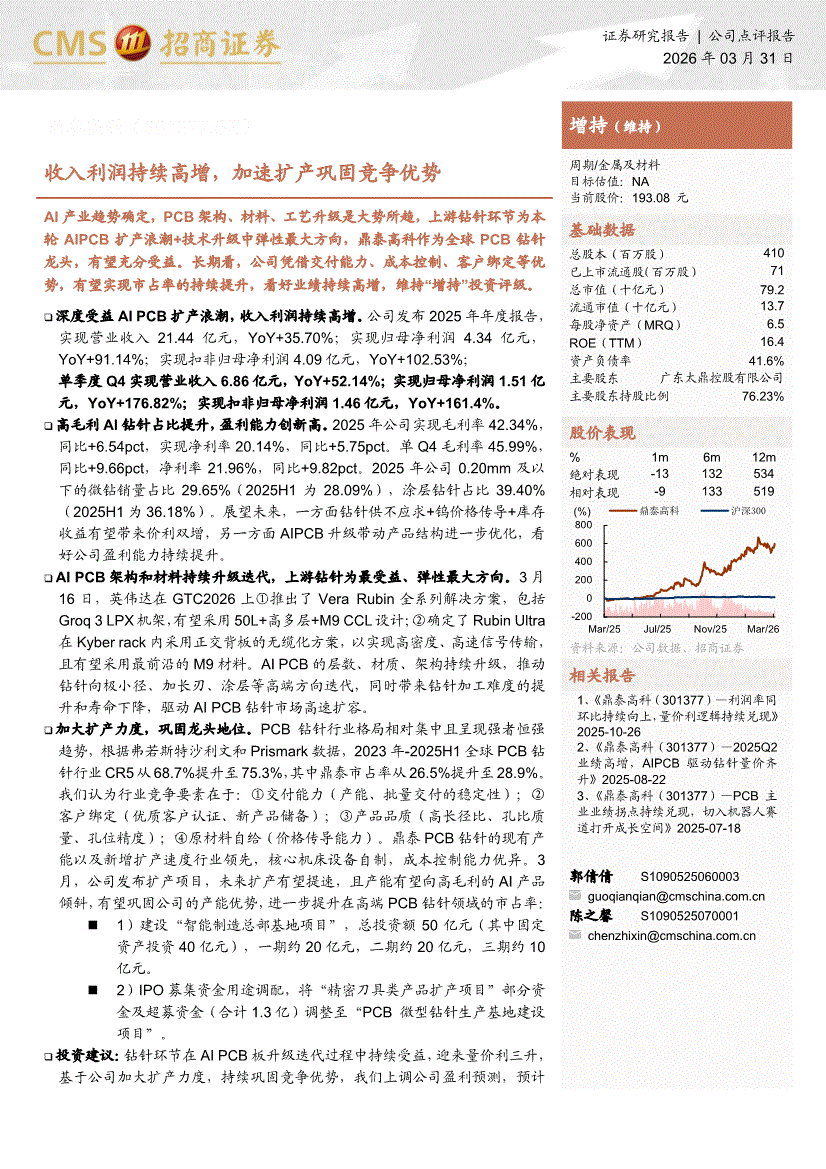 鼎泰高科:招商证券-鼎泰高科-301377-收入利润持续高增,加速扩产巩固竞争优势-260331