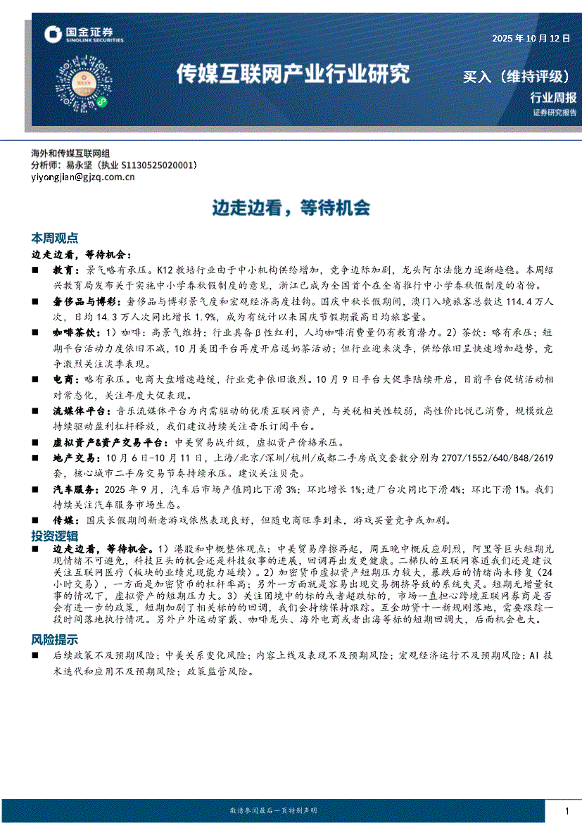 传媒互联网行业:国金证券-传媒互联网产业行业周报:边走边看,等待机会-251012