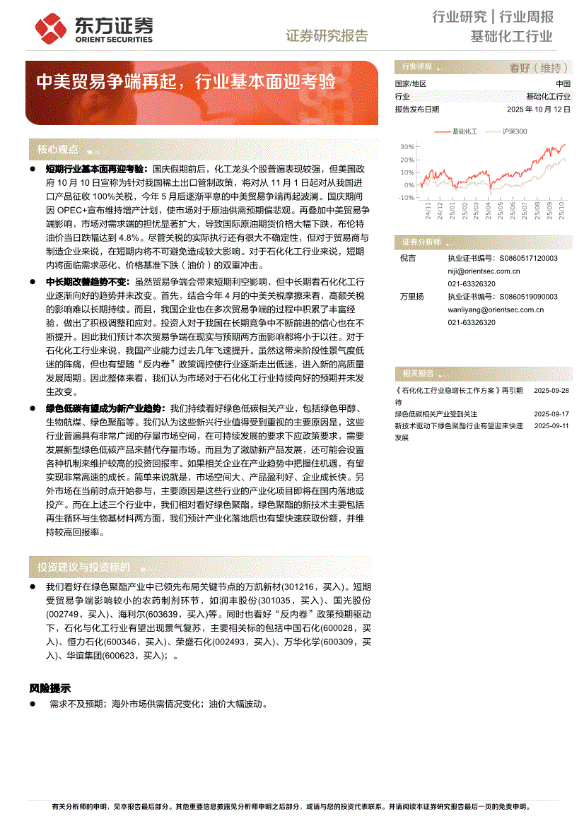 基础化工行业:东方证券-基础化工行业周报:中美贸易争端再起,行业基本面迎考验-251012