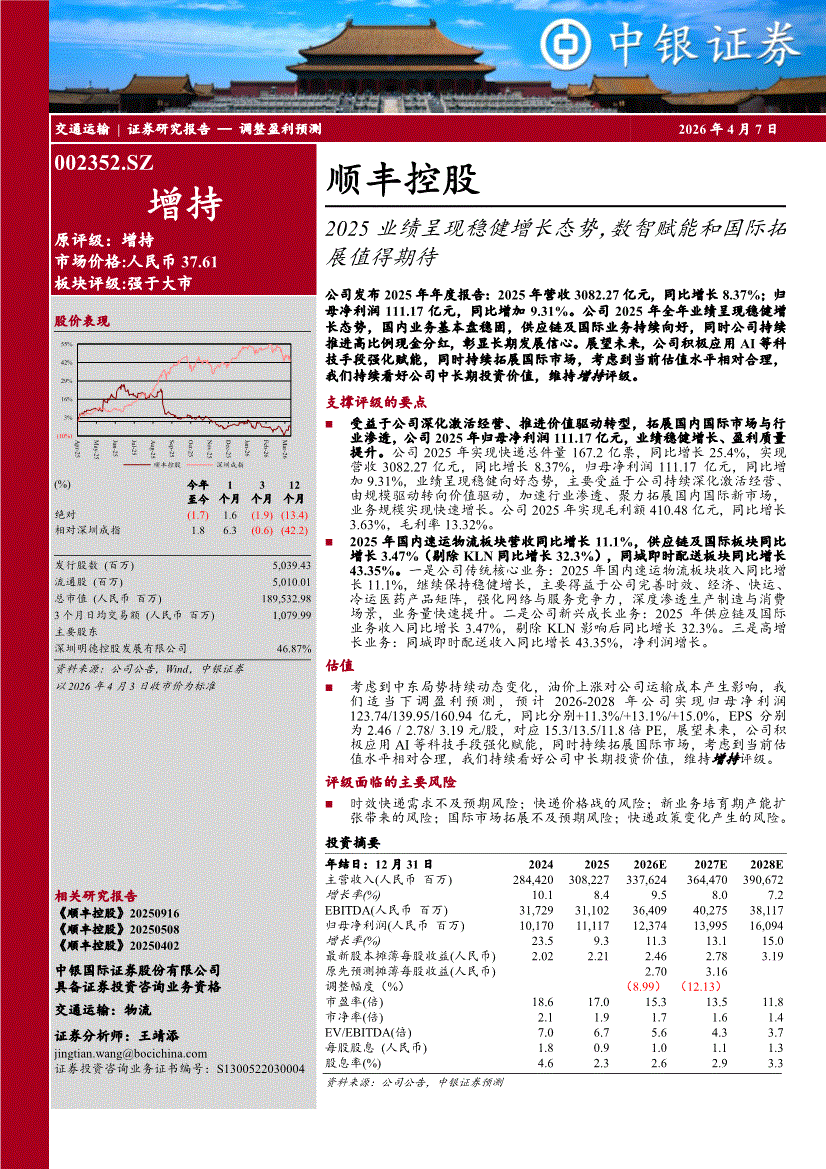 顺丰控股:中银国际-顺丰控股-002352-2025业绩呈现稳健增长态势,数智赋能和国际拓展值得期待-260407