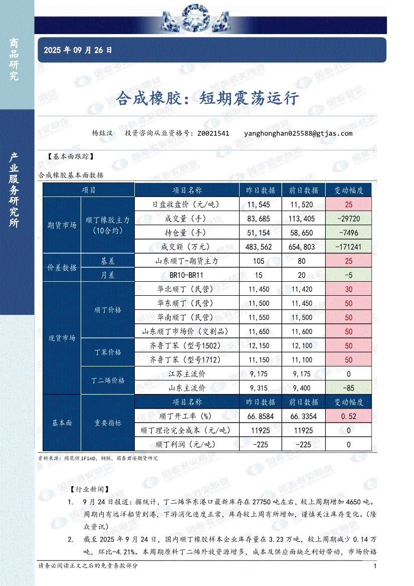 国泰君安期货-合成橡胶:短期震荡运行-250926