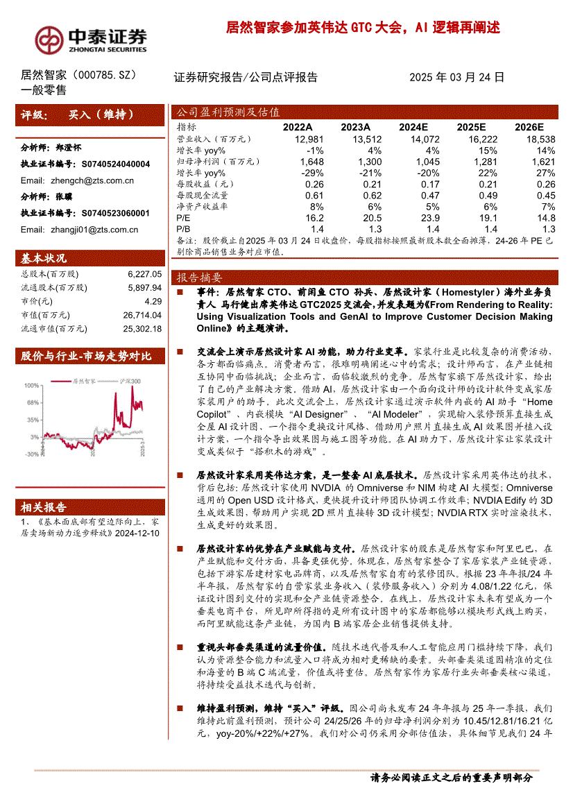 居然智家:中泰证券-居然智家-000785-居然智家参加英伟达GTC大会,AI逻辑再阐述-250324