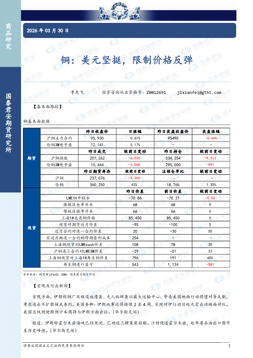 国泰君安期货-铜:美元坚挺,限制价格反弹-260330