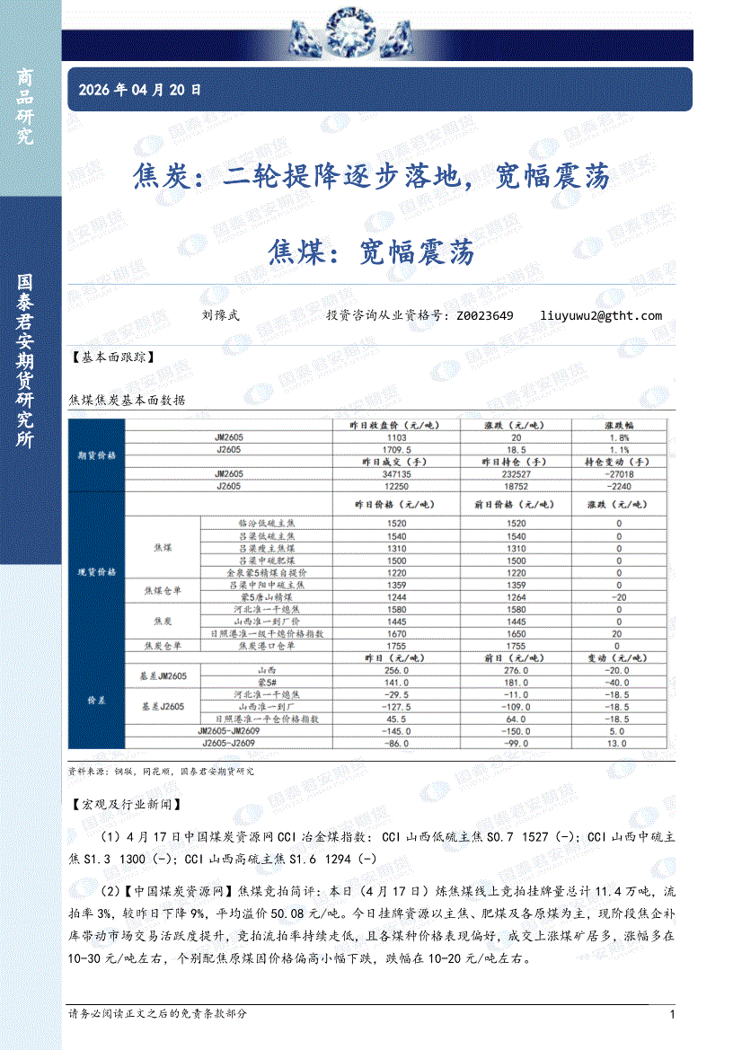 国泰君安期货-焦炭:宽幅震荡,焦煤,宽幅震荡-260414