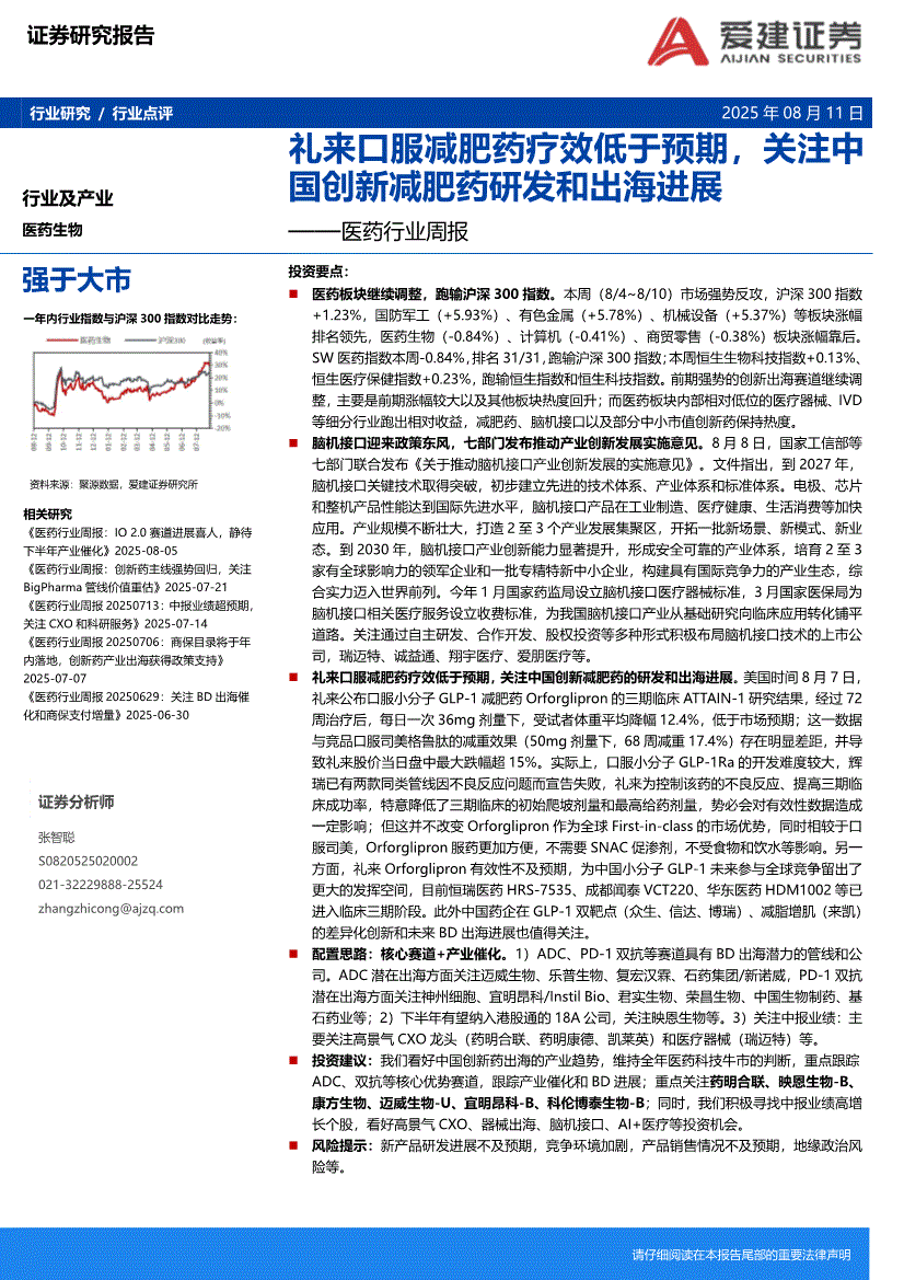 医药行业:爱建证券-医药行业周报:礼来口服减肥药疗效低于预期,关注中国创新减肥药研发和出海进展-250811