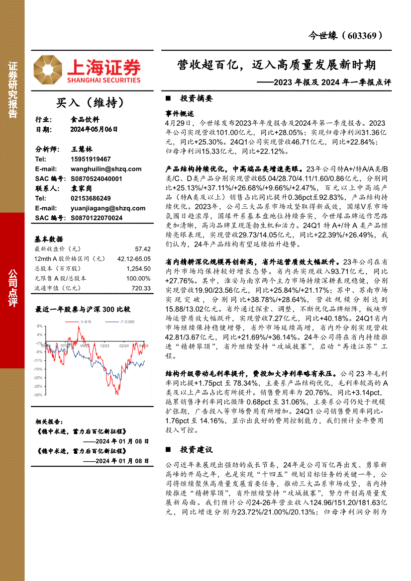 今世缘:上海证券-今世缘-603369-2023年报及2024年一季报点评:营收超百亿,迈入高质量发展新时期-240506