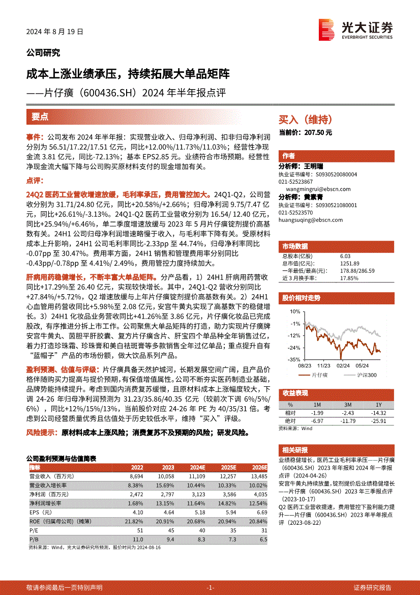 片仔癀:光大证券-片仔癀-600436-2024年半年报点评:成本上涨业绩承压,持续拓展大单品矩阵-240819