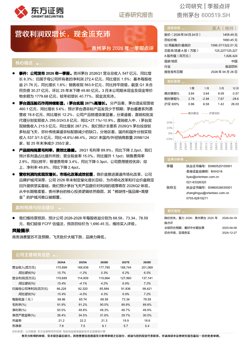 贵州茅台:东方证券-贵州茅台-600519-2026年一季报点评:营收利润双增长,现金流充沛-260426