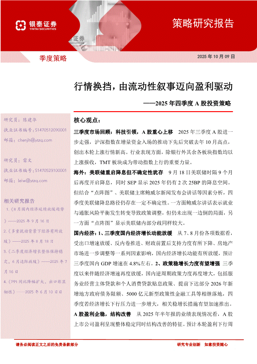银泰证券-2025年四季度A股投资策略报告:行情换挡,由流动性叙事迈向盈利驱动-251009