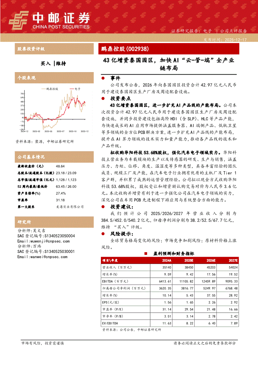 鹏鼎控股:中邮证券-鹏鼎控股-002938-43亿增资泰国园区,加快AI“云~管~端”全产业链布局-251217