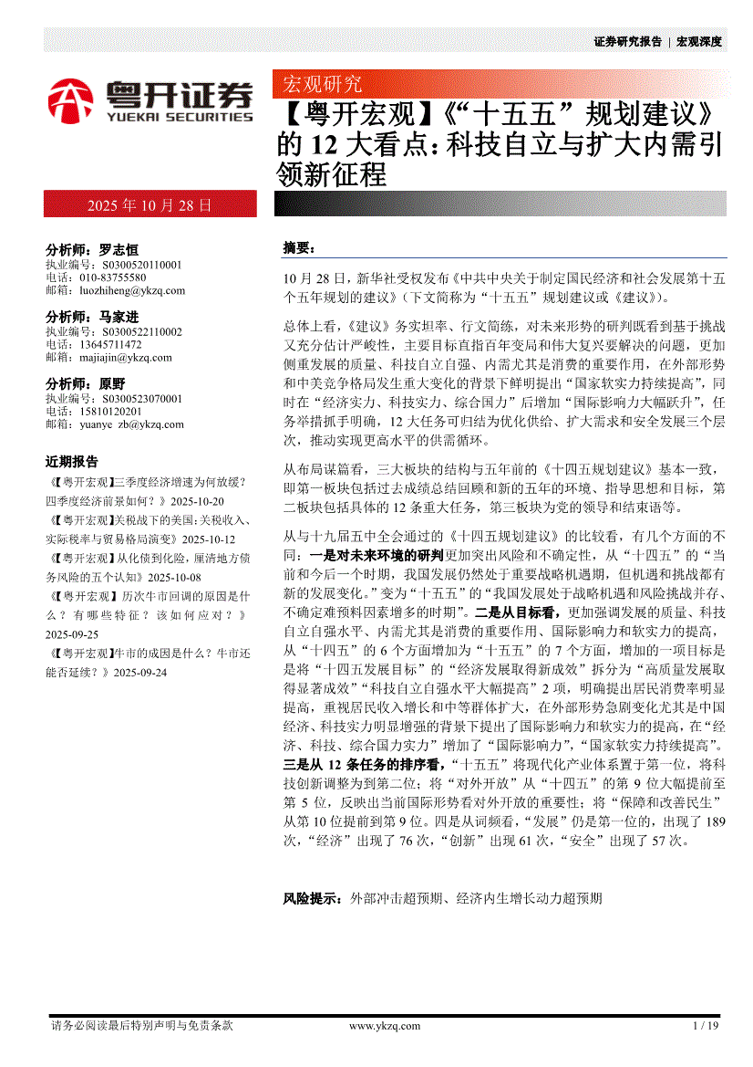 粤开证券-【粤开宏观】《“十五五”规划建议》的12大看点:科技自立与扩大内需引领新征程-251028
