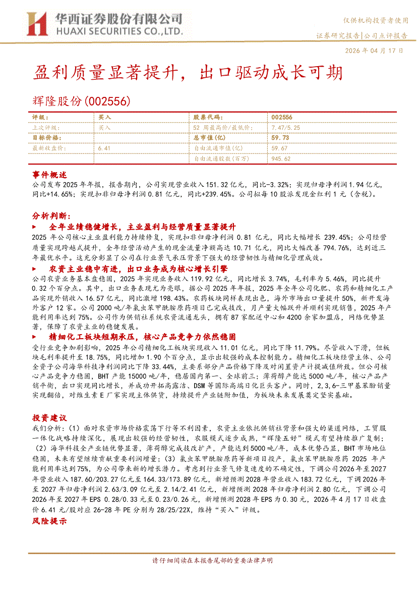 辉隆股份:华西证券-辉隆股份-002556-盈利质量显著提升,出口驱动成长可期-260417
