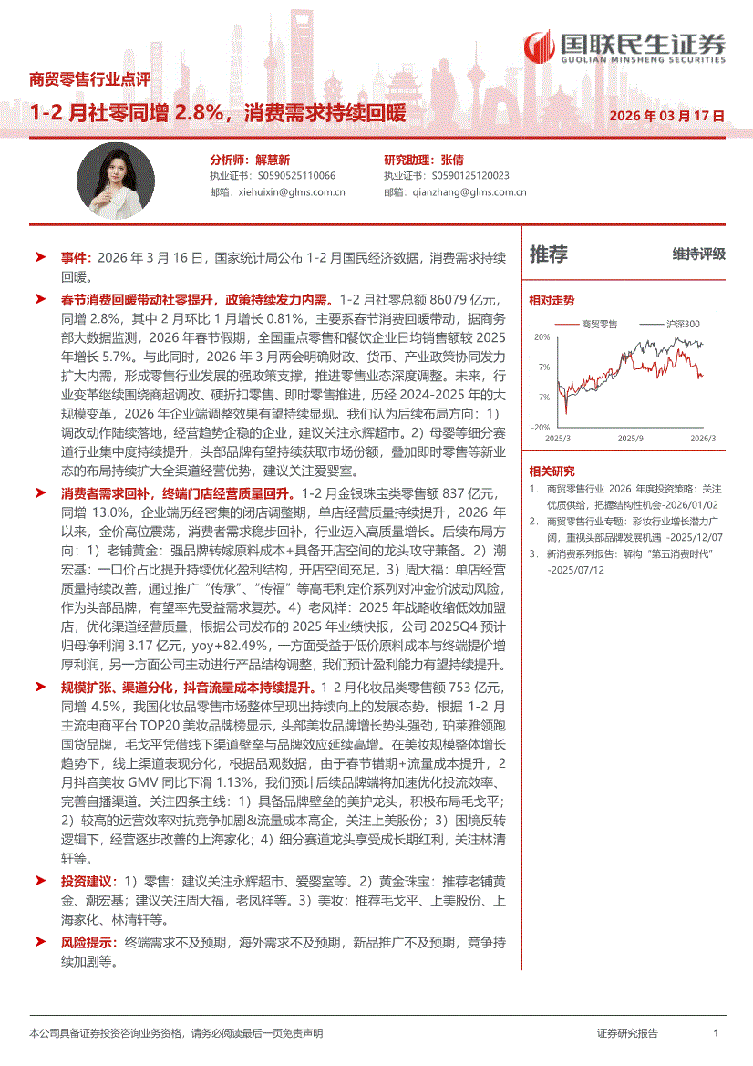 商贸零售行业:国联民生证券-商贸零售行业点评:1~2月社零同增2.8%,消费需求持续回暖-260317
