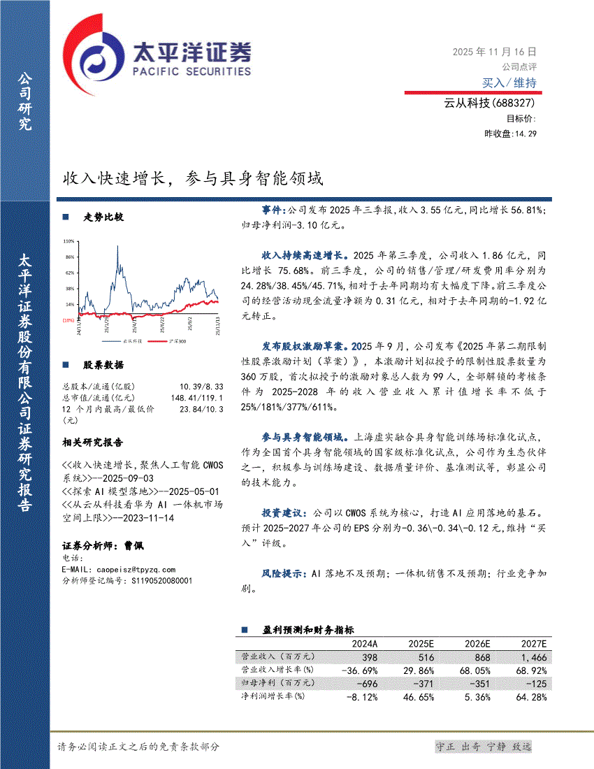 云从科技:太平洋证券-云从科技-688327-收入快速增长,参与具身智能领域-251116