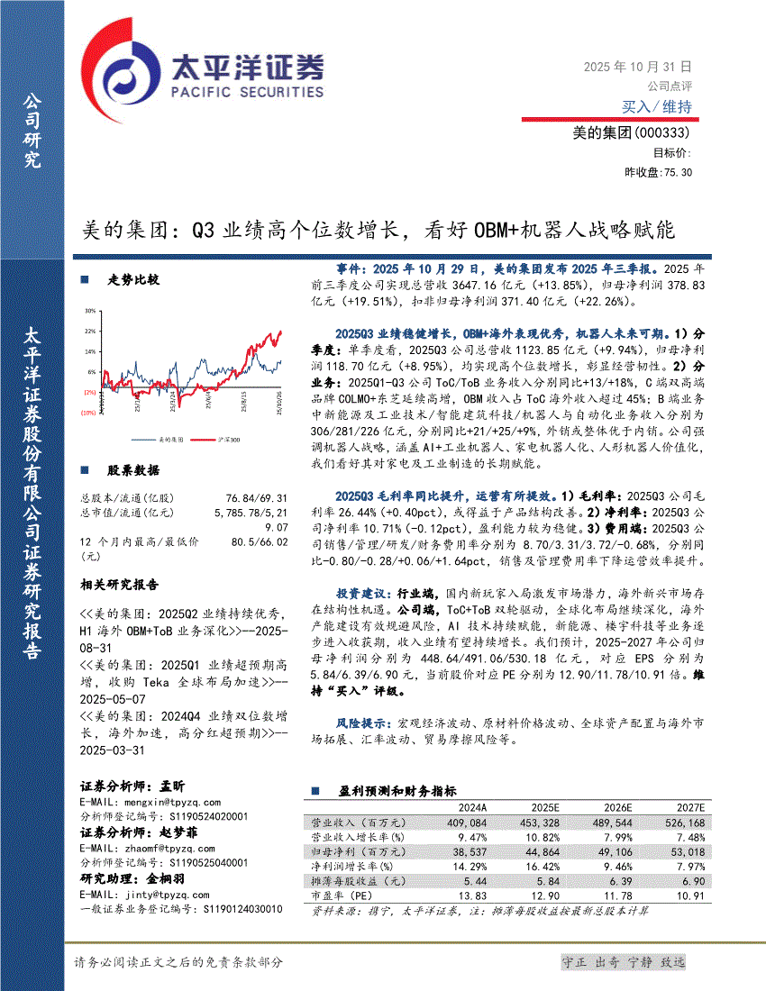 美的集团:太平洋证券-美的集团-000333-Q3业绩高个位数增长,看好OBM+机器人战略赋能-251031