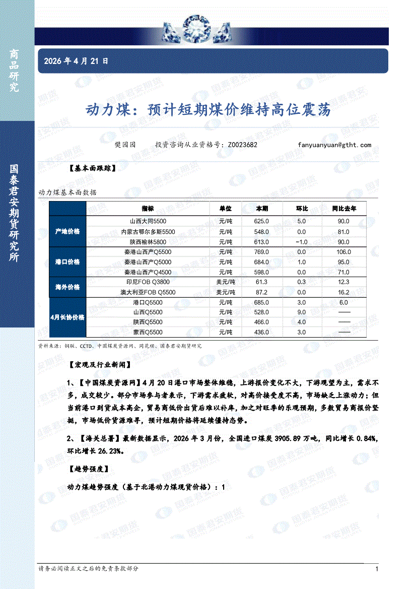 国泰君安期货-动力煤:预计短期煤价维持高位震荡-260421