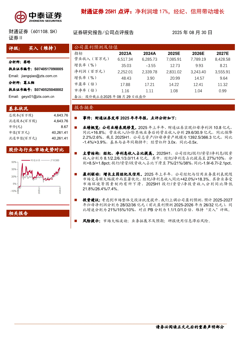 财通证券:中泰证券-财通证券-601108-25H1点评:净利润增17%,经纪、信用带动增长-250830