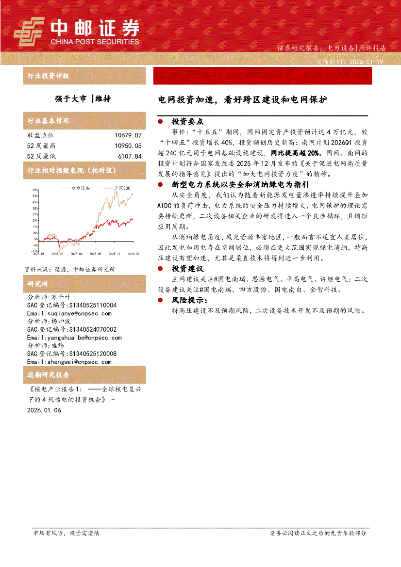 电力设备行业:中邮证券-电力设备行业:电网投资加速,看好跨区建设和电网保护-260119