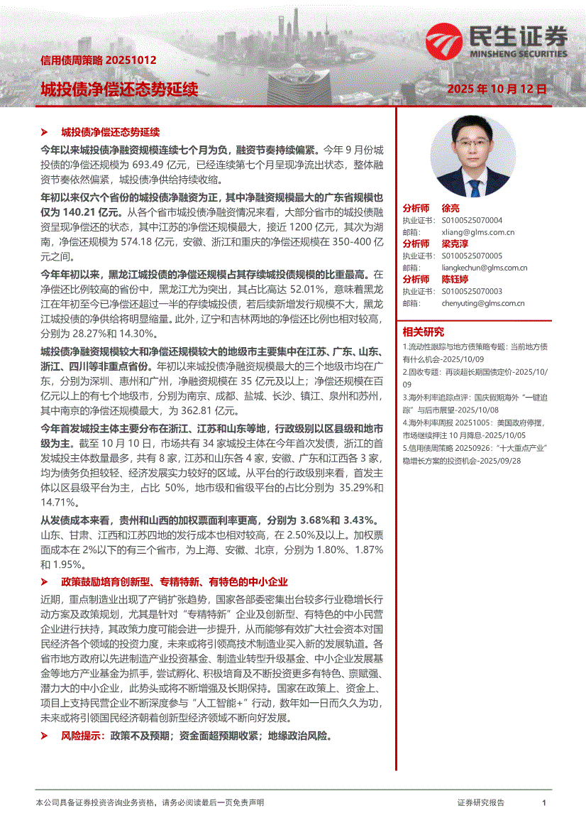 民生证券-信用债周策略:城投债净偿还态势延续-251012