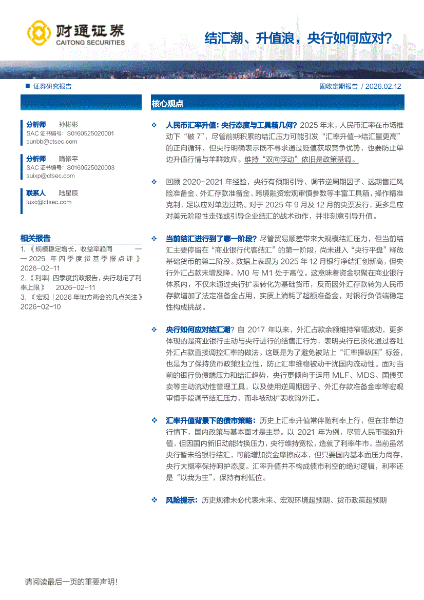 财通证券-结汇潮、升值浪,央行如何应对?-260212