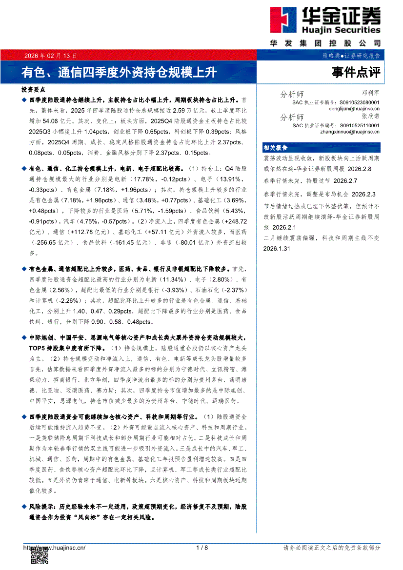 华金证券-有色、通信四季度外资持仓规模上升-260213